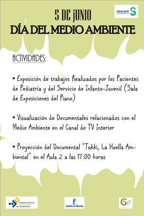 El Hospital de Ciudad Real realizará distintas actividades para conmemorar el Día Mundial del Medio Ambiente, como son, la exposición de trabajos realizados por los Pacientes de Pediatría y del servicio de Infanto-Juvenil. Concretamente se expondrán dibujos, paneles y fotografías, orientados a sensibilizar a todos los ciudadanos con el Medio Ambiente. Igualmente se proyectará el documental “Tukki, la huella ambiental”, y se emitirán documentales relacionados con el Medio Ambiente en el canal de TV Interior.