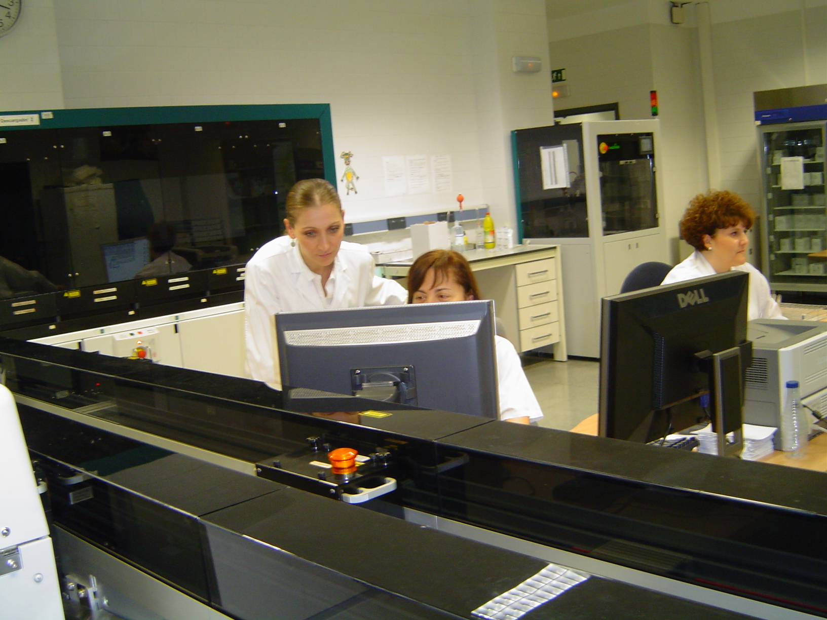 En este Área se realizan todas las tares extra analíticas. Los auxiliares administrativos crean/ capturan las peticiones de todas las solicitudes. Los tubos se procesan en el robot preanalitico Automate 800, que se convierte en el “notario del Laboratorio”, asegurando la entrada de los mismos, registrándolos. Posteriormente destapona, alícuota y clasifica para las distintas secciones no robotizadas. Esta sección se encarga de coordinar y garantizar que todos los informes llegan a los servicios peticionarios.