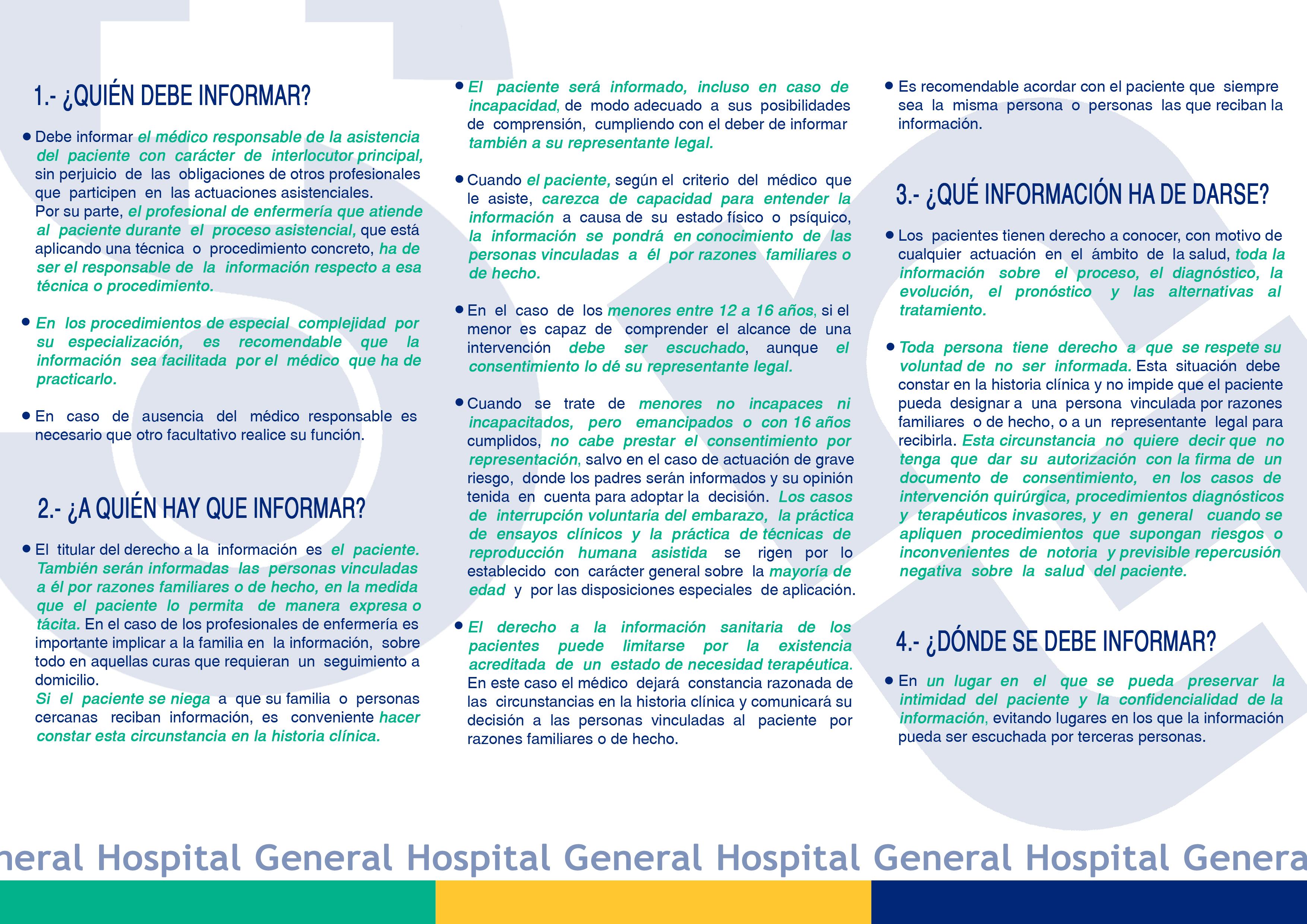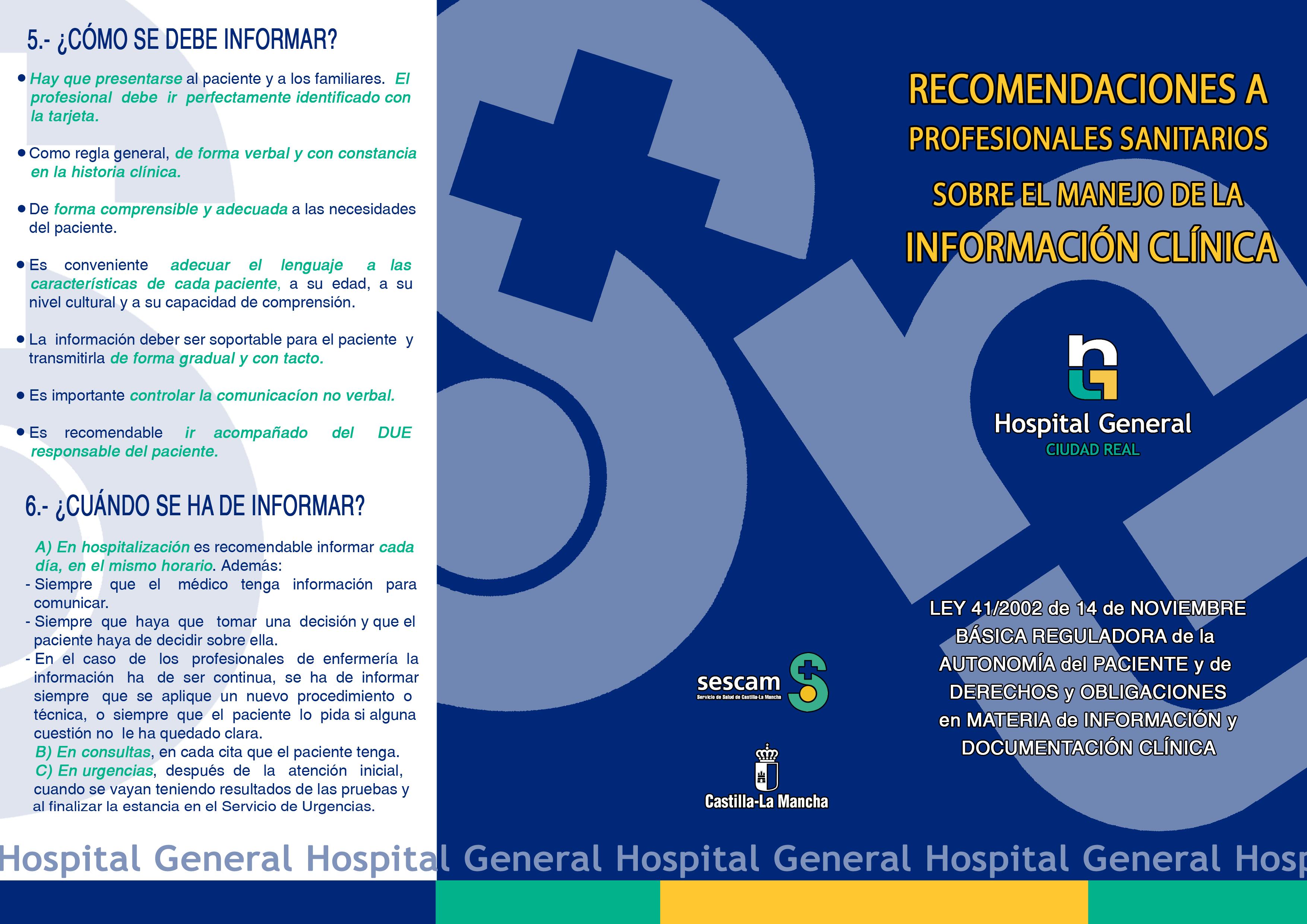 Como ejemplo de esto se puede destacar la elaboración de un tríptico con recomendaciones a profesionales sanitarios sobre el manejo de la información clínica adaptado a la Ley 41/2002 de 14 de Noviembre Básica Reguladora de la Autonomía del Paciente y de Derechos y Obligaciones en materia de información y documentación clínica.